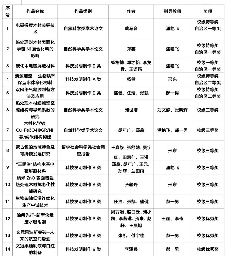 其中由潘艳飞老师指导的项目《 电磁梯度木材关键技术》、《热处理对木材表面化学镀 Ni 复合材料的影响》荣获自然科学类自治区一等奖。由邢东老师指导的项目《“清源洁流”——生物质环保型水体净化材料》荣获科技发明制作A类自治区二等奖,由潘艳飞老师指导的项目《碳化木电磁屏蔽材料》荣获科技发明制作B类自治区一等奖,由郝一男老师指导的项目《双网络气凝胶制备方法及应用》荣获科技发明制作B类自治区二等奖。