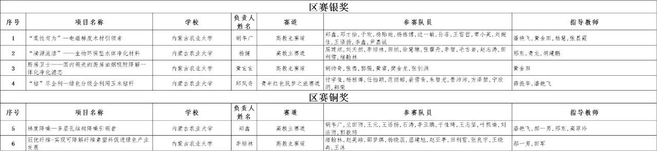 其中,由潘艳飞老师指导的项目《“柔性有为”——电磁剃度木材引领者》、邢东老师指导的项目《“清源流洁”——生物环保型水体净化材料》、黄金田老师指导的项目《厨房卫士——国内领先的厨房油烟吸附降解一体化净化滤芯》、薛振华老师指导的项目《“秸”尽全利—绿色分级全利用玉米秸秆》分别获得了自治区银奖的好成绩,由潘艳飞老师指导的项目《梯度降噪—多层孔结构降噪引领者》以及由郝一男老师指导的《冠优纤维-实现可降解纤维素塑料促进绿色产业发展》项目分别获得了自治区铜奖的佳绩。