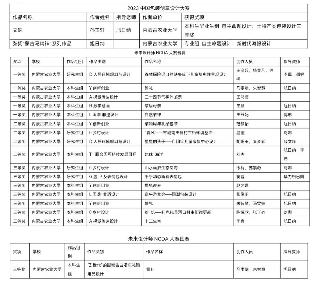 在2023中国包装创意设计大赛中公司旭日纳老师指导参赛的作品《文味》获得本科生毕业生组自主命题设计:土特产类包装设计三等奖,旭日纳老师个人参赛作品《弘扬“蒙古马精神”系列作品》获得专业组自主命题设计:新时代海报设计三等奖。在未来设计师NCDA省赛中公司学子的作品取得了一等奖5项,二等奖4项,三等奖7项的好成绩。同时由旭日纳老师指导的项目《誓礼》取得未来设计师NCDA大赛国赛三等奖的优异成绩。