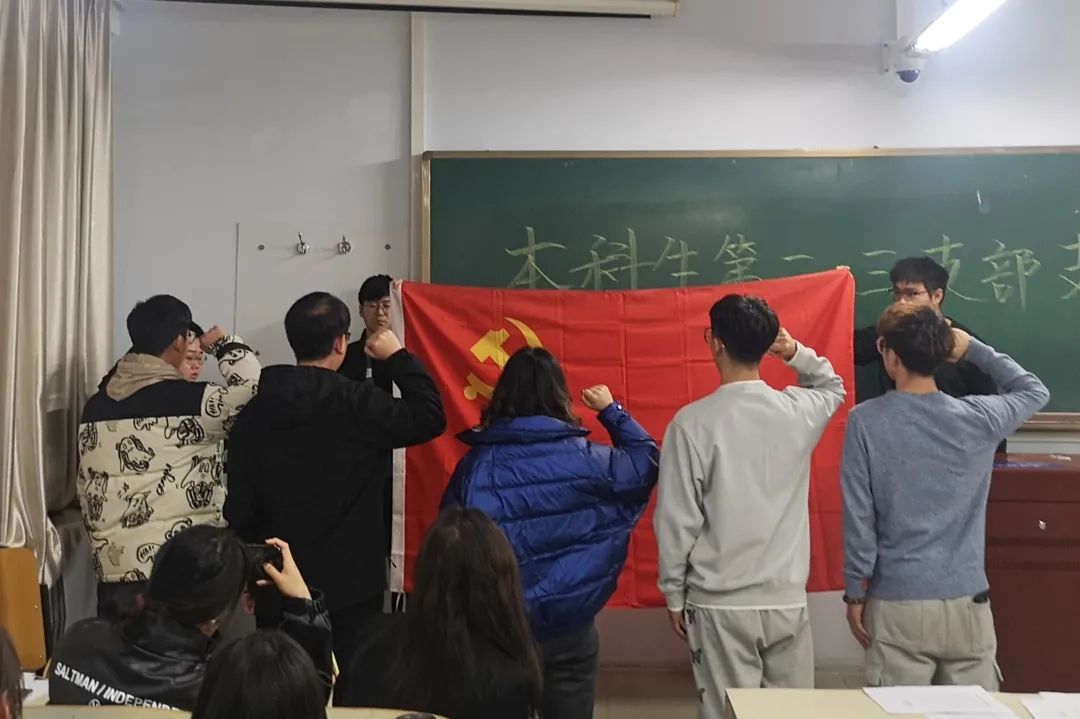 会议伊始,卫书记向大家宣读本次新发展党员工作情况,简述预备党员转正过程,由6名预备党员依次上台进行转正汇报,各位预备党员宣读转正申请书,总结作为预备党员期间进行的理论学习以及在实践中的收获。同时卫书记对入党积极分子提出了新的要求。随后,12名拟发展对象依次进行汇报总结。他们从学习、生活、工作等多方面进行汇报,反思自己的优势与不足,向党支部表明自己的态度和决心。汇报结束后,在场的正式党员进行支部大会无记名投票。经公开唱票后,卫书记宣布大会决议,本次全体预备党员全票通过考察。最后,在卫书记的带领下,6名预备党员面对党旗,庄严宣誓,开启了他们政治生活的新起点。同时,卫书记对转正党员表示祝贺并勉励各位党员要时刻牢记自己的党员身份,在未来的学习和生活中继续进步,勇担重任。