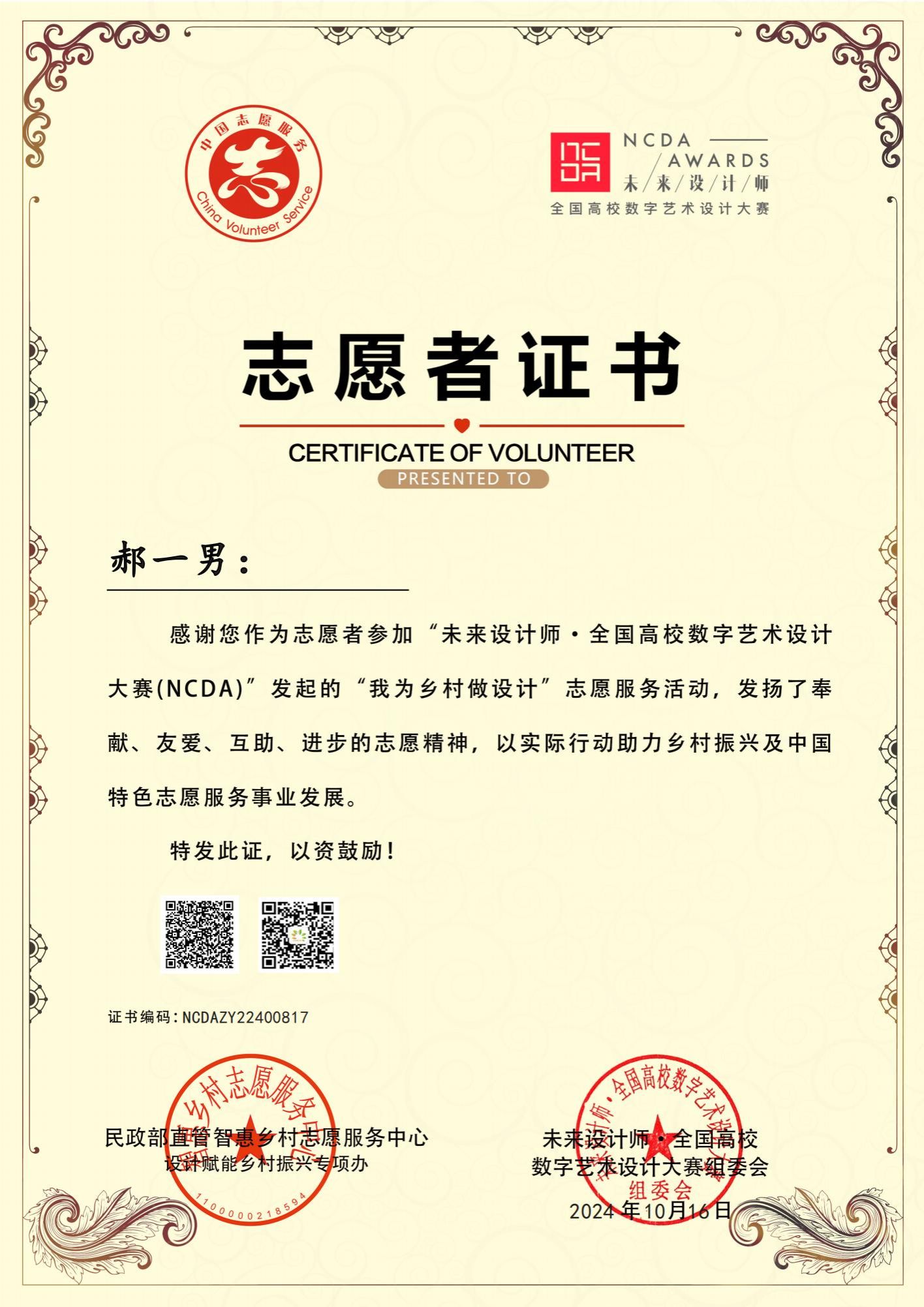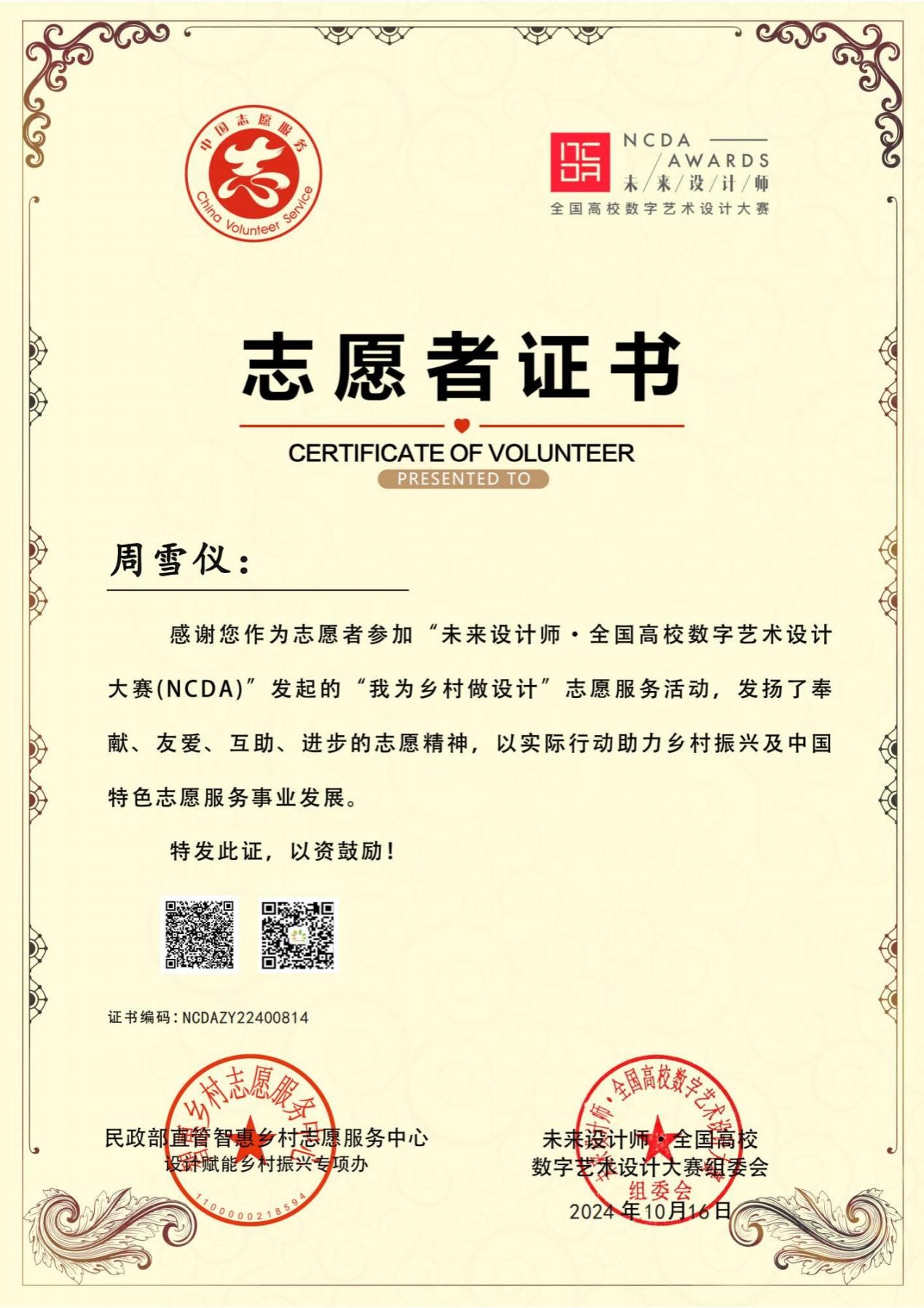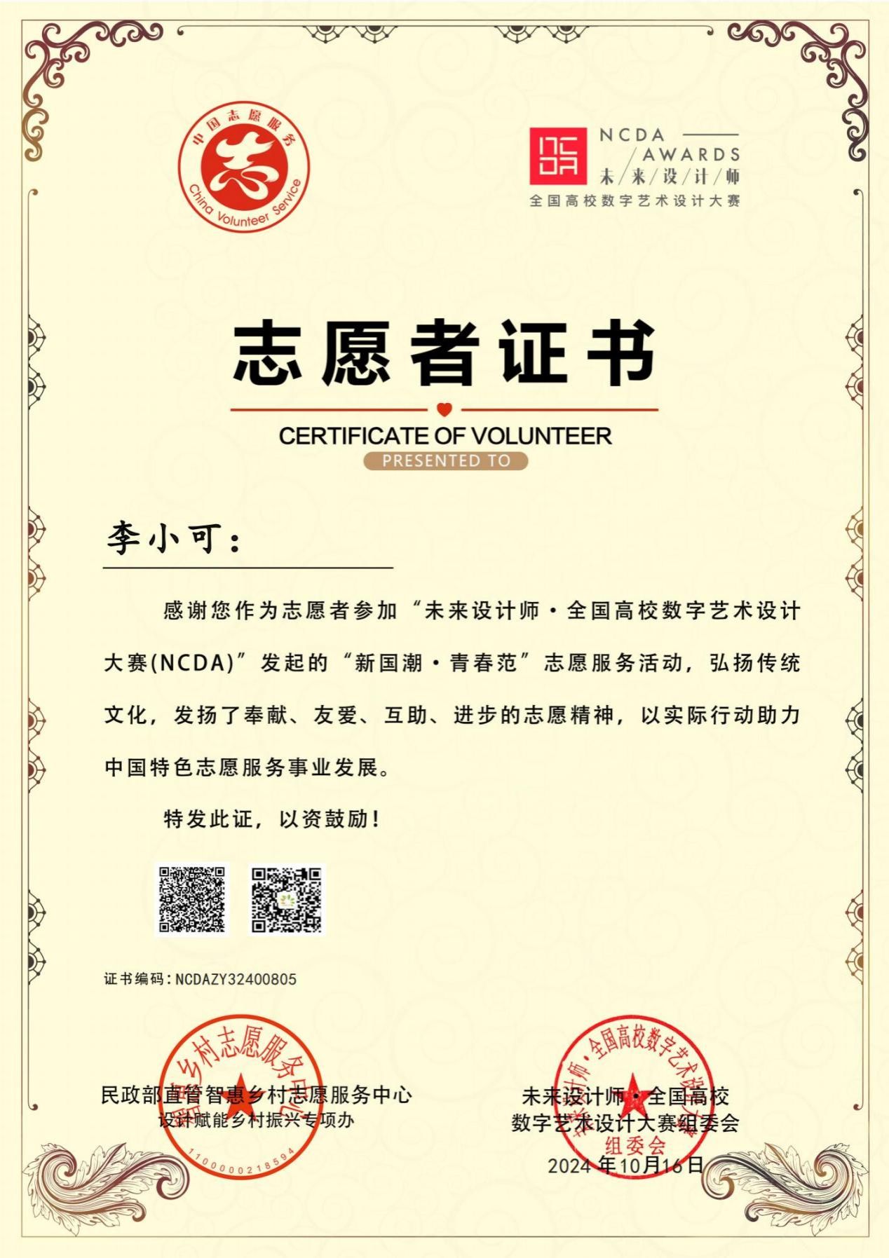 为弘扬奉献、友爱、互助、进步的志愿精神,表彰此次活动的优秀者,主办方于2024年9月19日为williamhill威廉希尔师生颁发了“我为乡村做设计”、“新国潮、青春范”志愿服务活动先进个人证书。鼓励师生们用实际行动和专业知识助力乡村振兴、国潮,感谢所有师生对中国特色志愿服务事业发展做出的贡献。